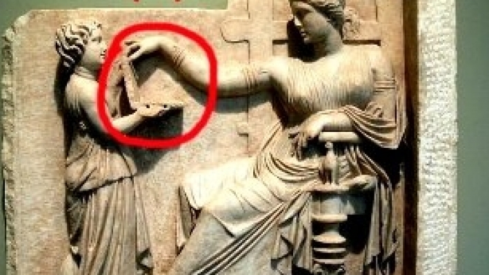 Aşa s-ar putea interpreta sculptura greacă, veche de peste 2.100 de ani, care a fost creată undeva în jurul anului 100 î.Hr, scrie lovendal.ro. Minunea poate fi văzută pe piatra de mormânt a unei femei împreună cu un copil-sclav. Copilul ţine în mână către femeie ceva ce pare a fi un… laptop din zilele noastre.